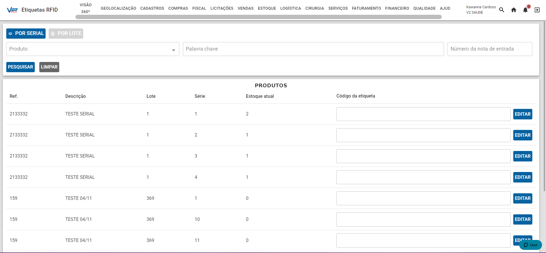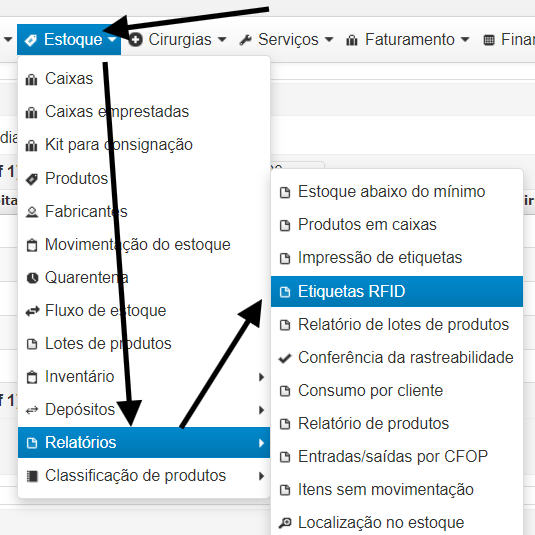 Para cadastrar essas etiquetas, acesse: MENU ESTOQUE > RELATÓRIOS > ETIQUETAS RFID
