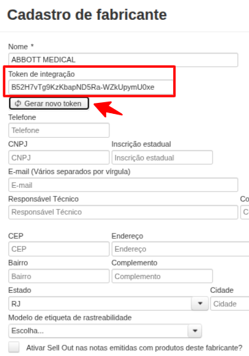 - No cadastro do fabricante clique em 'Gerar novo token' para gerar o token de identificação que será utilizado nas consultas da Neogrid.